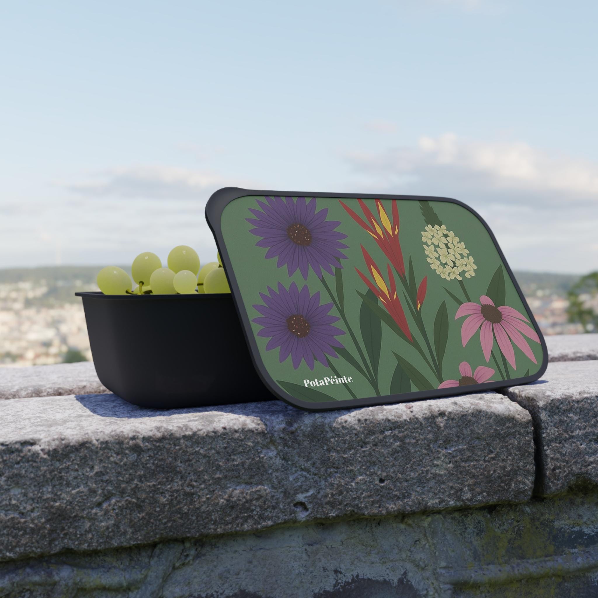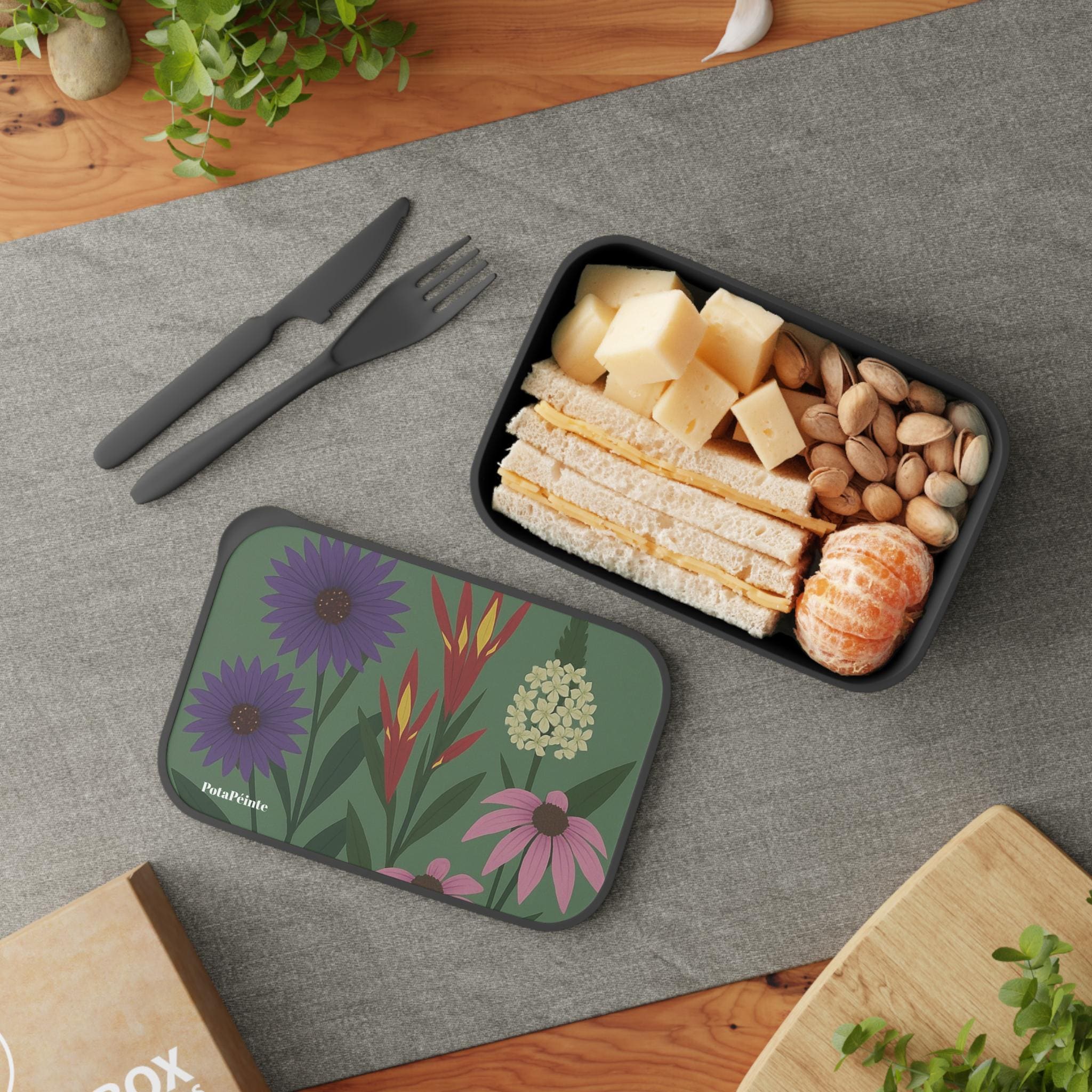 Green Floral Bento Box with Utensils - Eco-Friendly Plant Starch