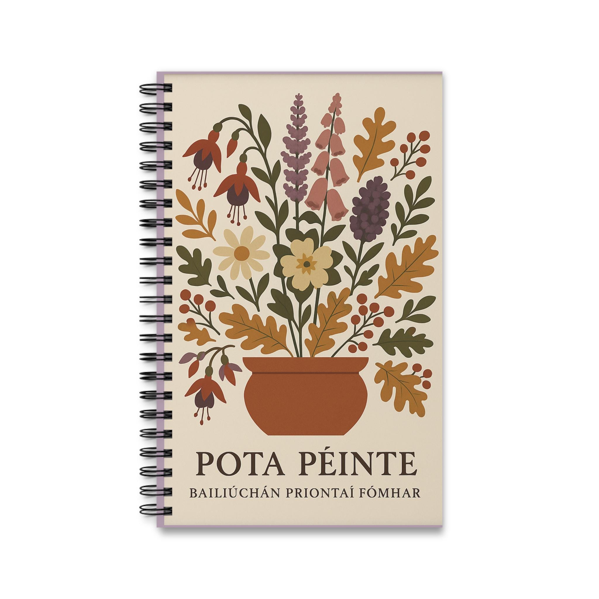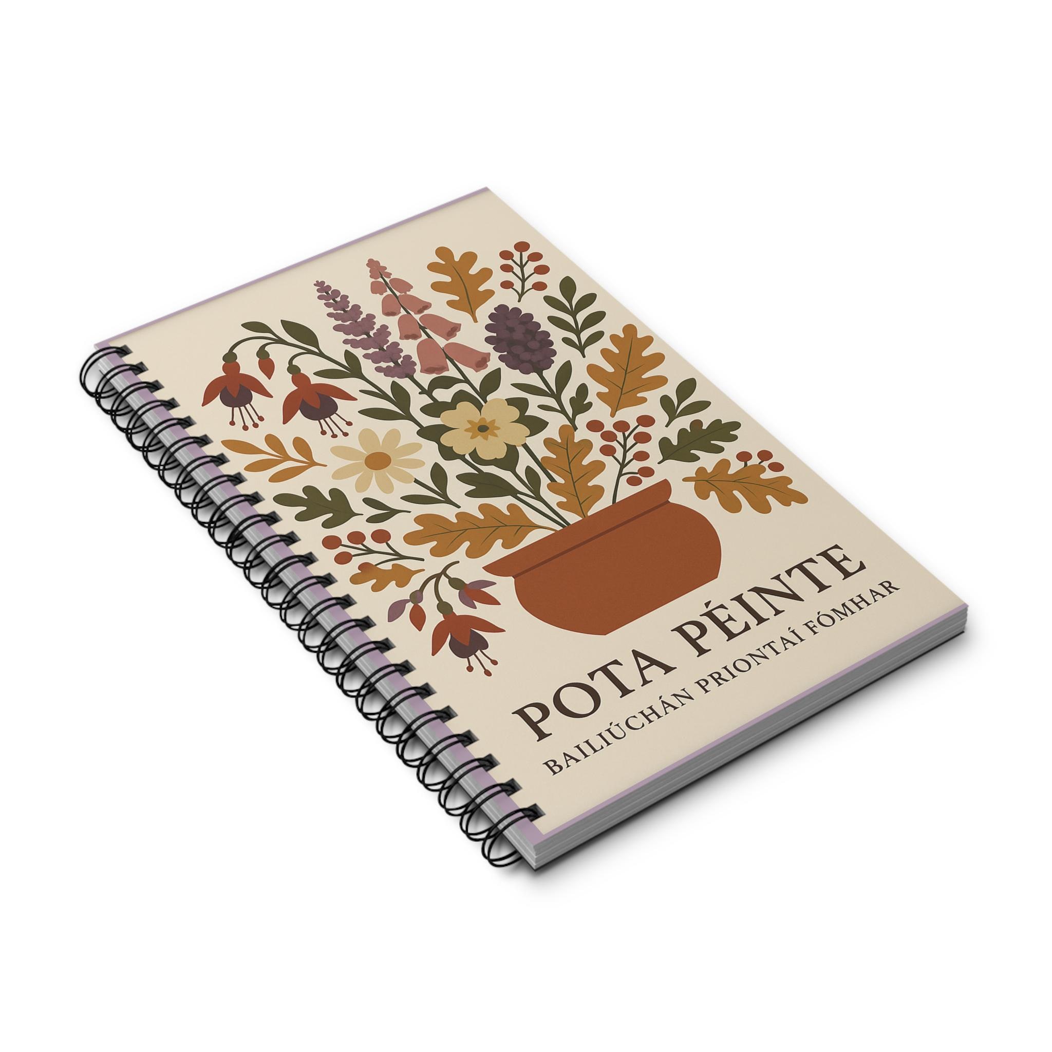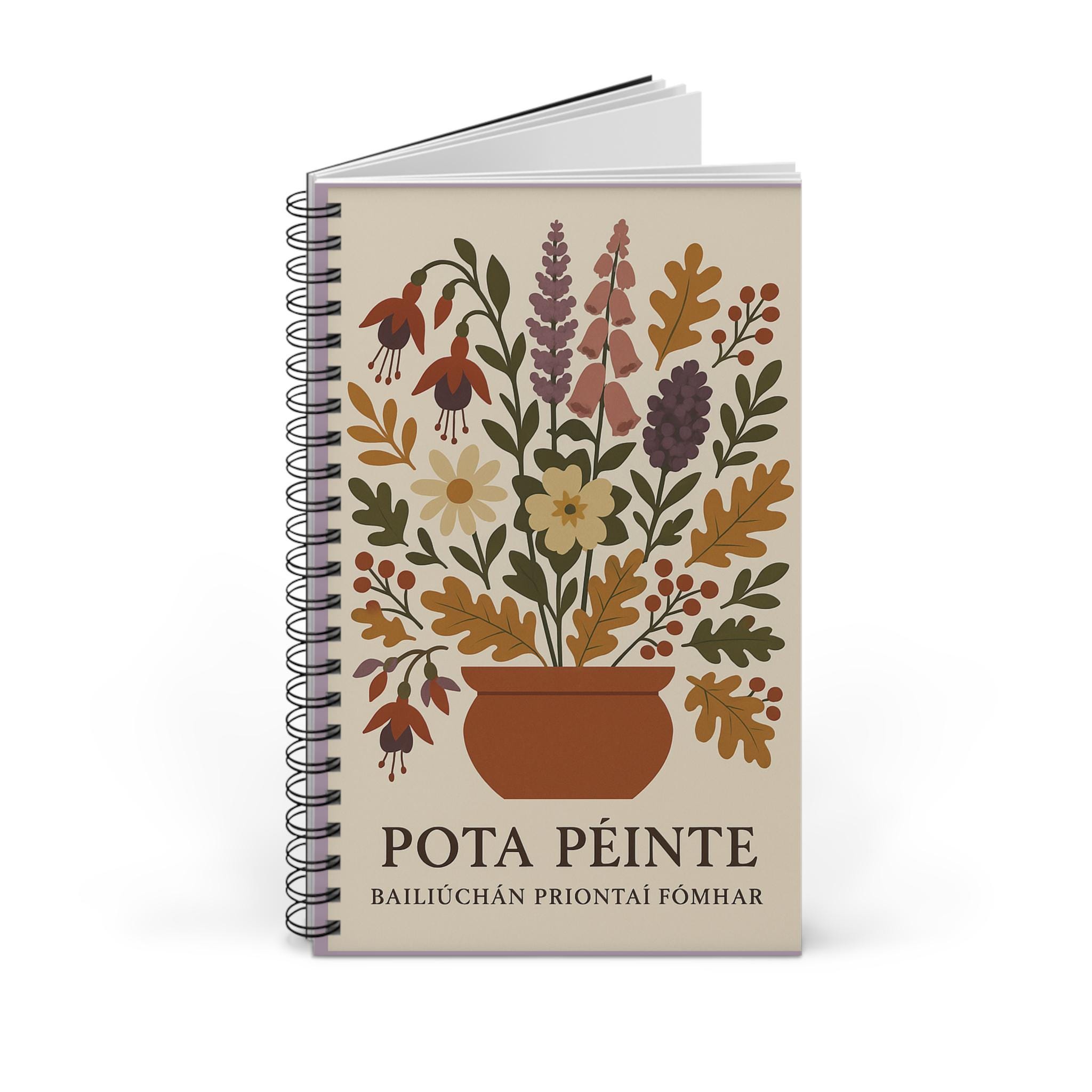 Product features - 90gsm paper is perfect for writing with lines for guidance - Paper inserts come in 4 variations - Semi-gloss laminated cover ensures a smooth look and long-lasting - Made for adults with REACH certification, ensuring safety and quality - Spiral binding allows for easy flipping and flexibility, perfect for on-the-go note-taking Custom design inspired by wild flowers found in Connemara, Ireland during autumn.