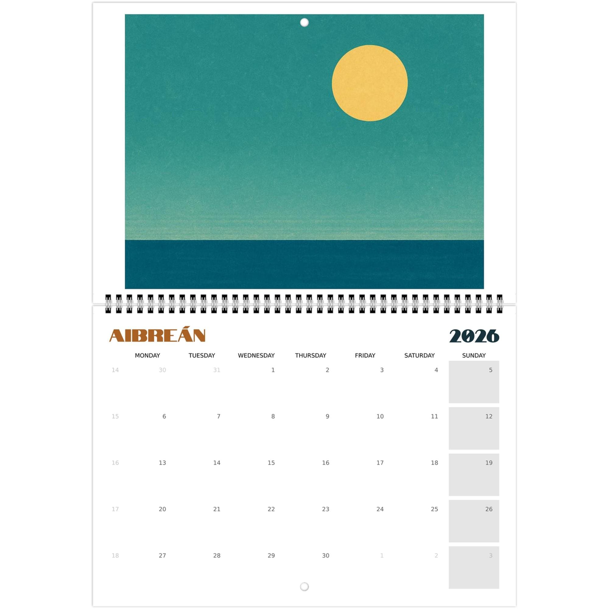 Features: - A4 horizontal, wire binding with hanger - Bilingual with months in Irish and days in English - Printed in vibrant, full-color on 250gsm coated silk paper (100 lb cover) with professional packaging for a flawless delivery. Eco-Friendly - Made with FSC/PESC-certified papers and local production to minimize our environmental impact.